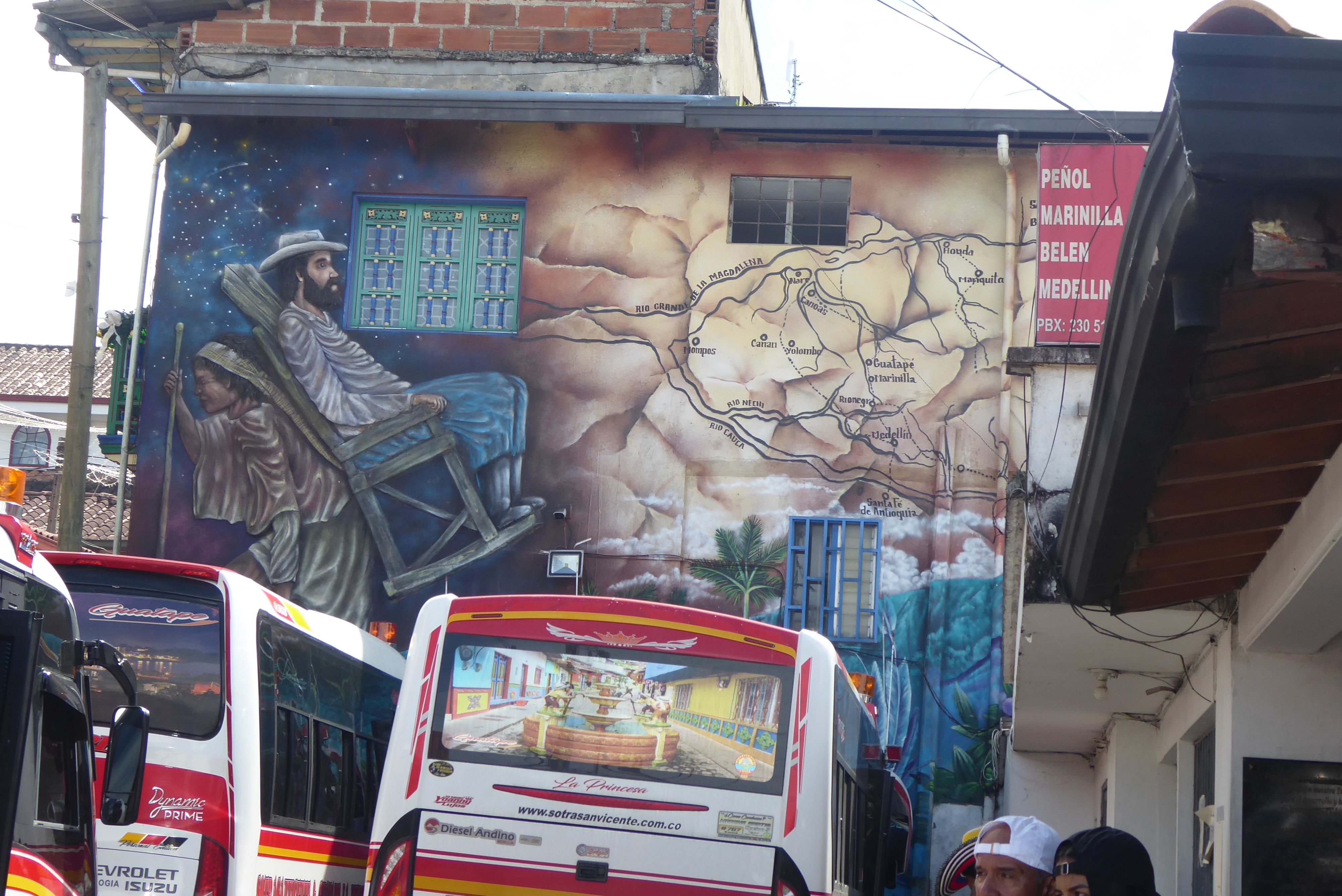 This strange picture is the mural on the wall where the buses park. Later I noticed the person in the bottom left who seems to be carrying the man in the chair. ??