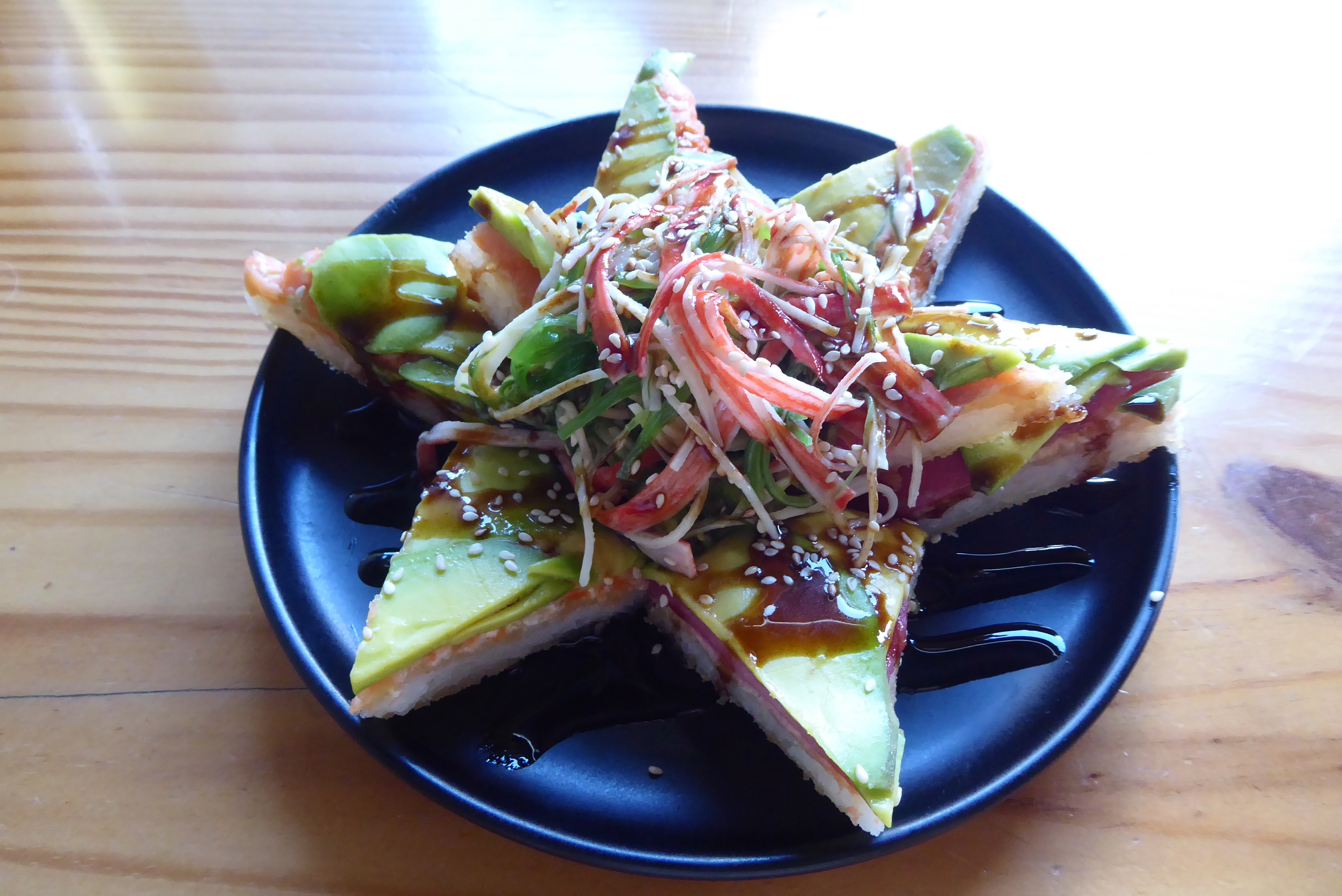I was amazed. The menu said that sushi pizza was created in Vancouver, Canada. I loved it. The rice is the crust and slightly crunchy. I can see lots of variations of this gluten free pizza! Winn said he will try it sometime.