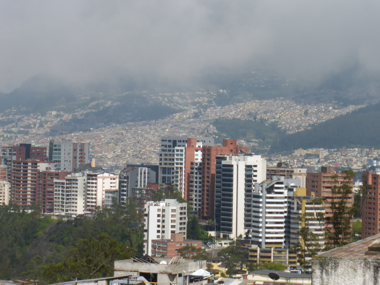 A view of Quito which sits in a narrow valley with mountains and volcanoes rising up around it.