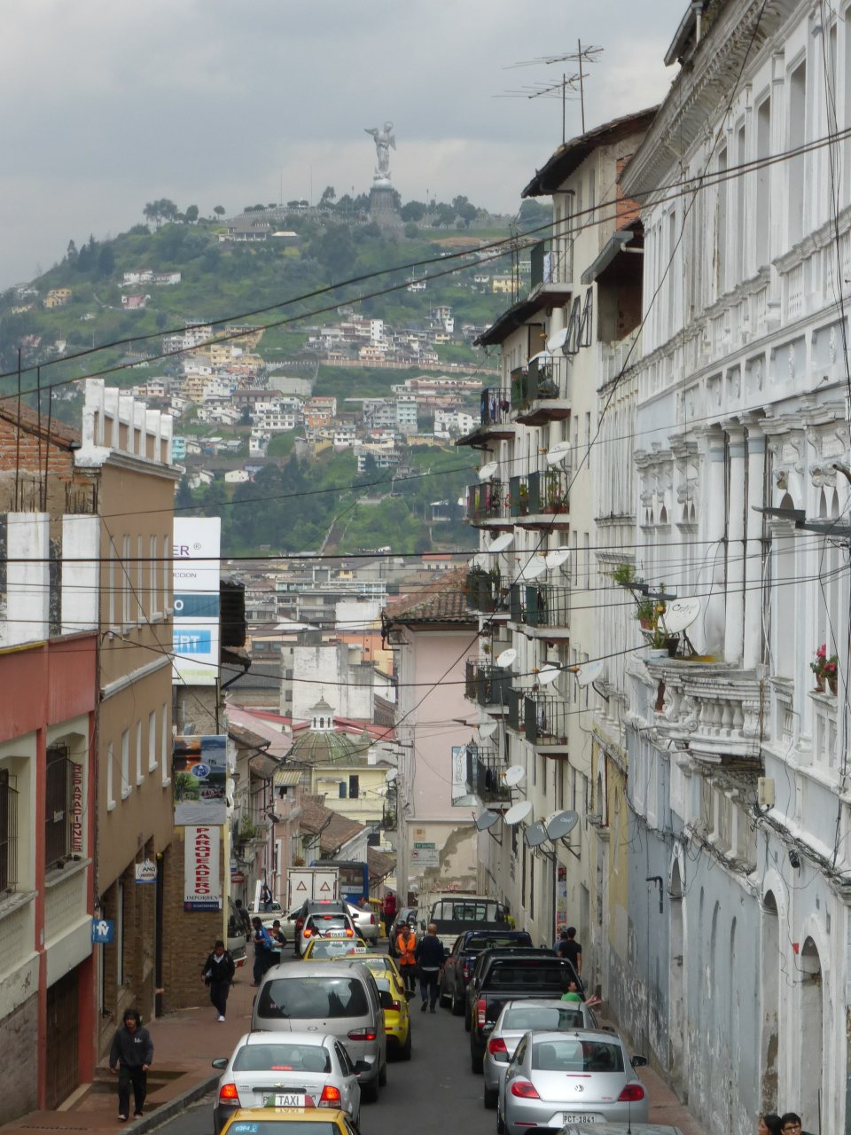 The historic section of Quito has very narrow streets. From here we can get a glimpse of the Angel of Quito on the hill overlooking the old section.