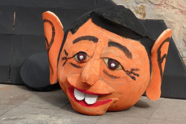 On New Year's eve we caught a glimpse of the finished display. It was this head on a tall body dangling bags of money.