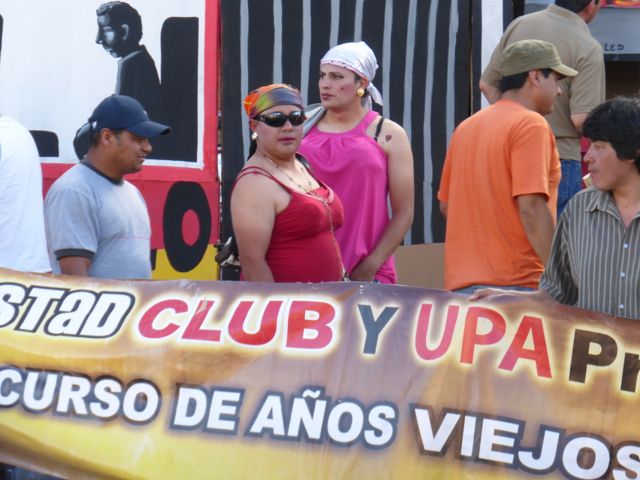 These 'ladies' play an important role in the neighborhood festivals. They are men dressed in women's clothing to represent the widows of the past year. The funds they collect from people in cars or on foot help buy the drinks for the party to come later in the evening.