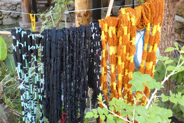 These are lengths of thread that are being dyed. The tied sections have resisted the dye and when woven produce the ikat design that this town is famous for.