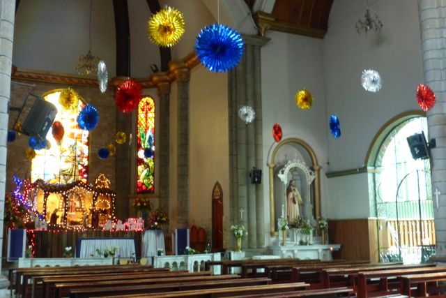Inside the church in Gualaceo at Christmas with blinking lights on the altar and colorful plastic decorations.