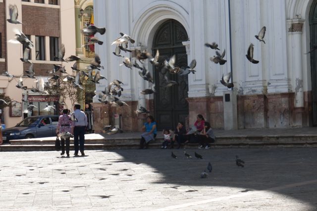 A couple strolling through the plaza in front of Santo Domingo church stirs up the pigeon population.