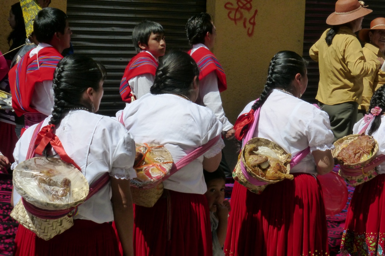 On their backs are small baskets similar to the extra big baskets that they strap on to carry big loads. In the baskets are typical foods of the area including Cuy (related to the guinea pig).
