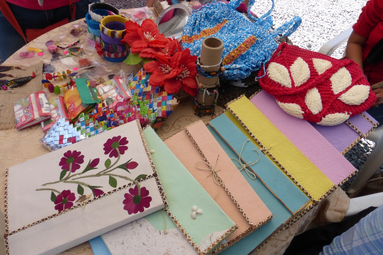 These crafts were made by a group of women from the coast under the supervision of a Peace Corp volunteer from Connecticut. The paper products are made from recycled paper and near the top you can see two bags woven with Plarn (plastic yarn) from recycled plastic bags.