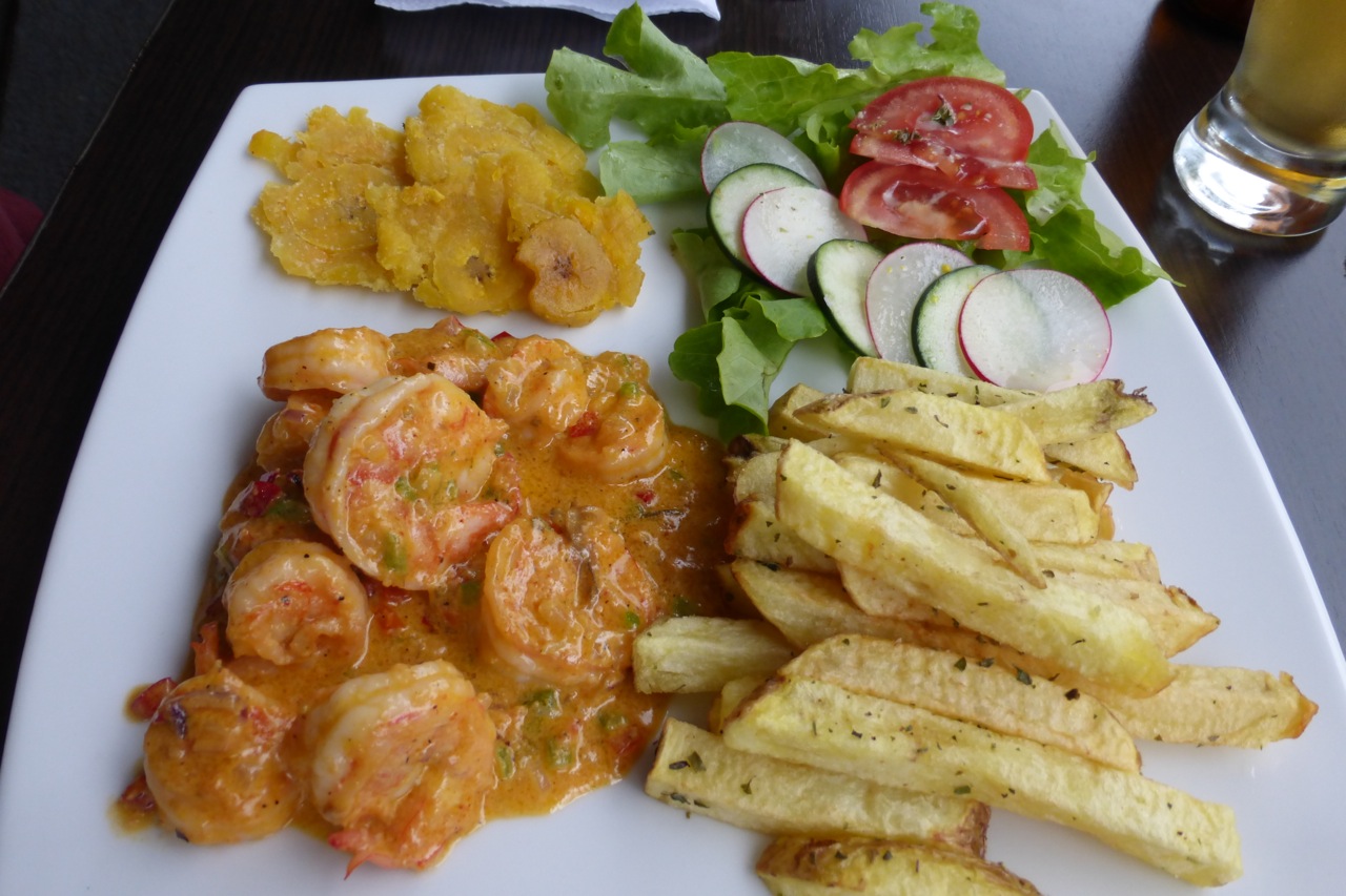 There is a new restaurant on the river called MYO. Great location and patio. Winn got this beautiful plate of shrimp, fries, patacones (fried plantains) and salad. He loved it.