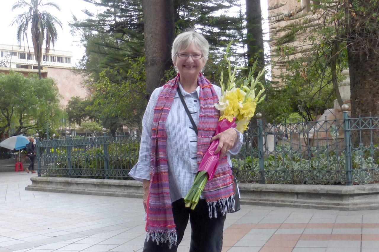 I was headed across Parque Calderon one morning when a friend called out to me that I 'look like a picture' so I gave her my camera and asked her to take my picture...so here I am with a $5 armful of gladiolas from the flower market. I wove the big scarf that I'm wearing for my sister and me. She has a matching scarf to wear in North Carolina while I'm way down here south of Equator. BIG NEWS: We just got our residency visa which allows us to live here indefinitely and our cedula which is a national identification card. We plan to be here at least two years and probably more so make plans to come visit!