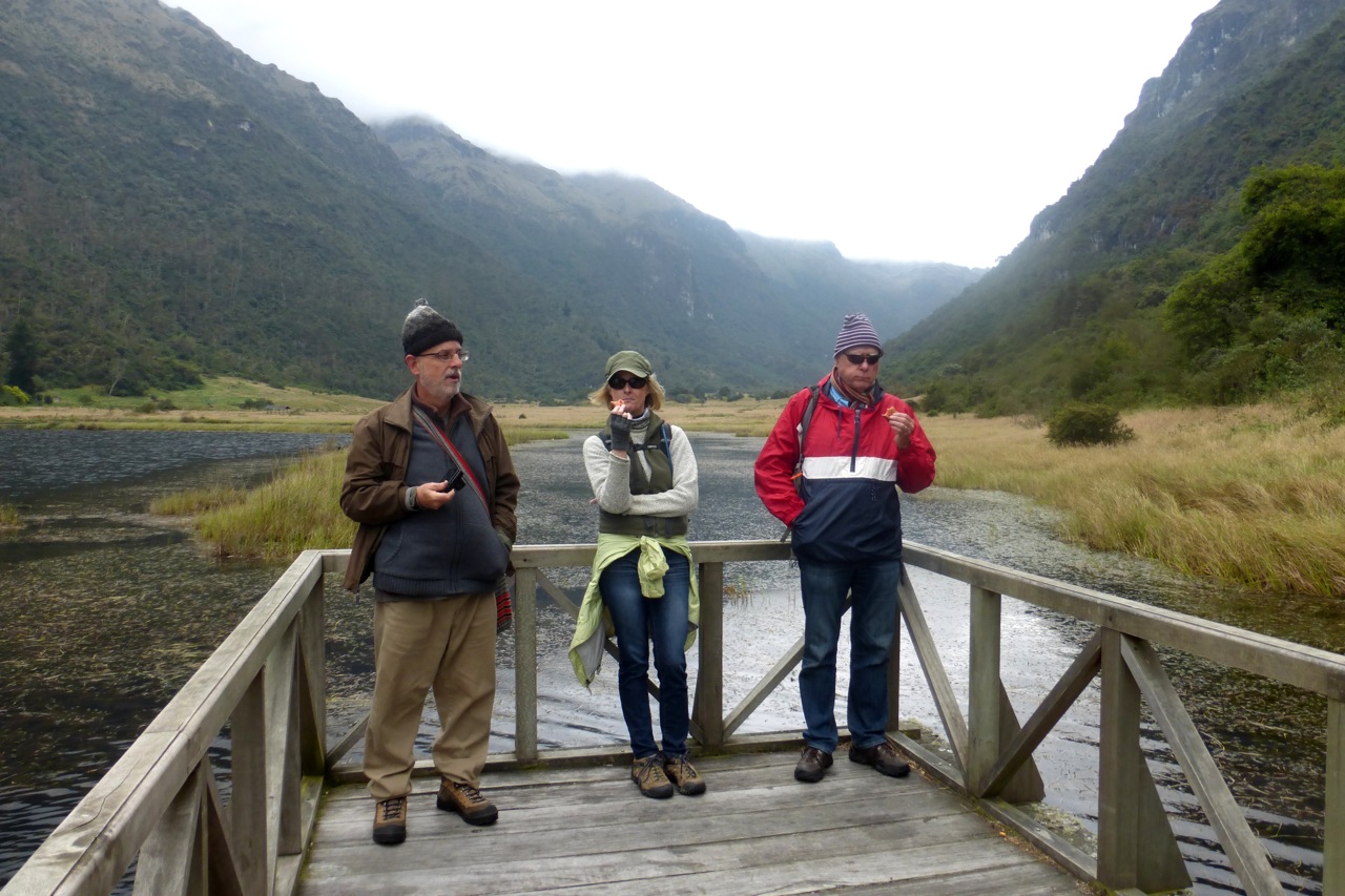 Winn, Carole Ann and Ron taking a snack break on one of the docks of Lake Llaviuco which is in the cloud forest of the Cajas Mountains outside of Cuenca.
