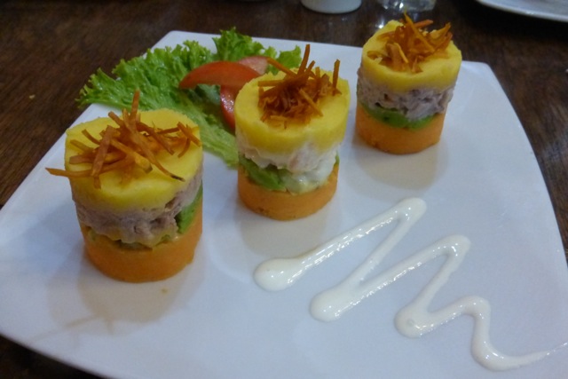 These are potato patties stuffed with tuna, shrimp and octopus at the Peruvian Gastronomy restaurant.