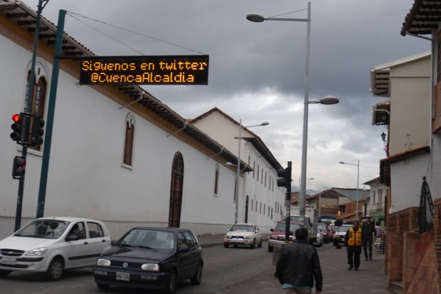 I have seen two electronic signs like this in Cuenca. I guess they will use them for traffic info later but right now the messages are like this one which says 'Follow us on Twitter @CuencaAlcadia'.