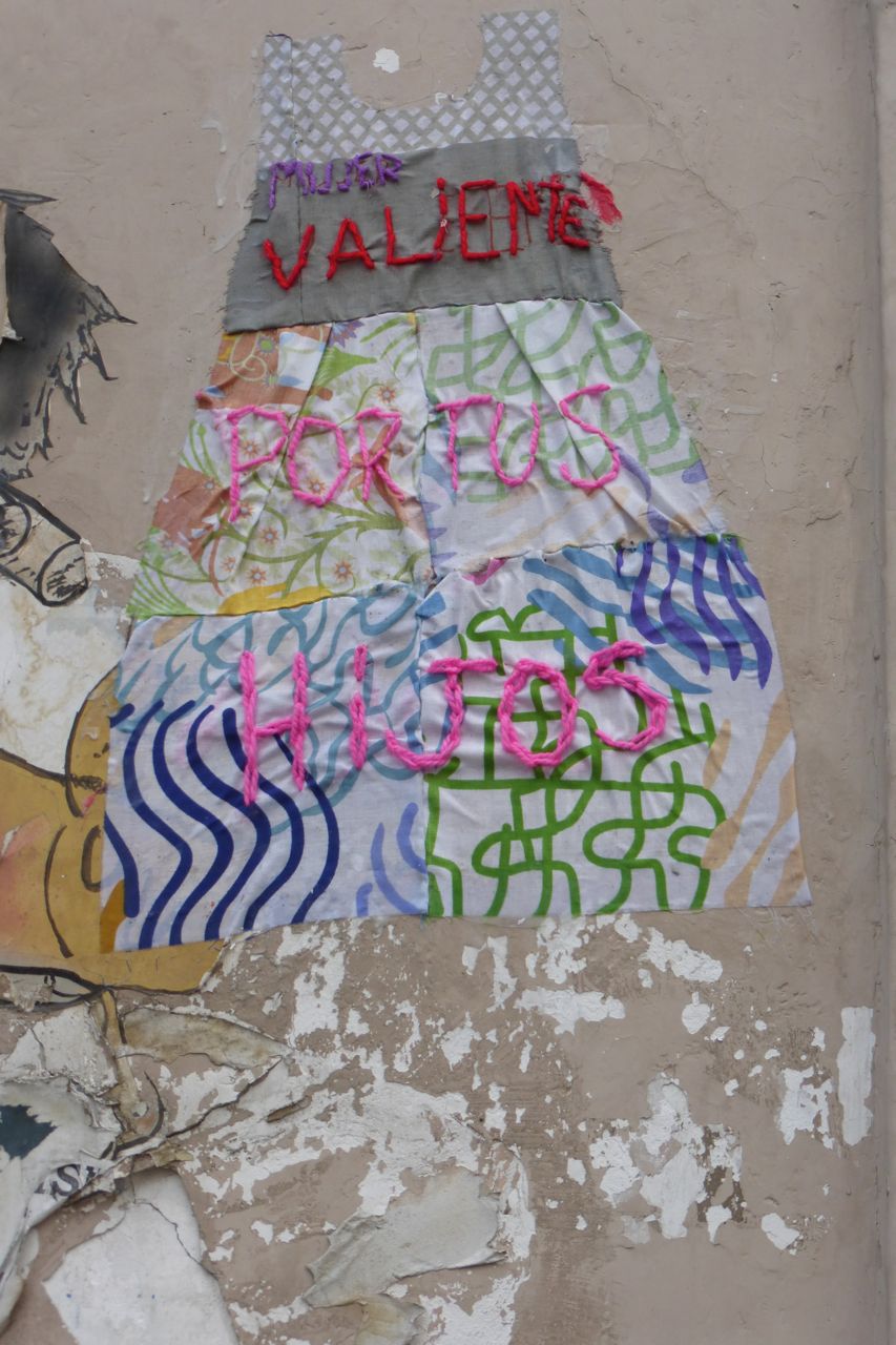 This is an interesting kind of grafitti. It is a cloth dress with an embroidered message. This one says 'Women be brave for your children."