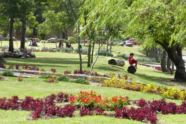 This is Paradise Park which is a huge park with soccer fields, kids area and beautiful gardens. Two of the four rivers running through Cuenca meet at the far end of this city park.