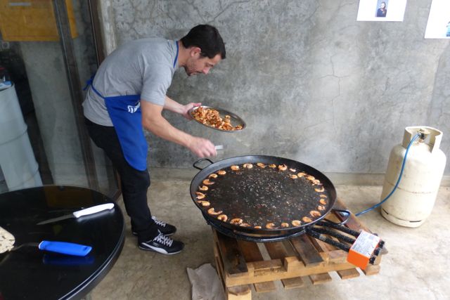This is Gustavo, chef from Spain via Britain, preparing Arroz Negro con Camarones outside on the patio at Republic Sur one of our new favorite places to enjoy food and ambiance on the Tomebamba riverside.