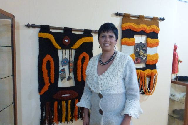 After we walked Sharon home, we headed for our house and went past what looked like a gallery opening so we went in. It was a WEAVER! This is Monica Malo Piedra, weaver of tapestries and fabric for clothing. The party was to open her new studio which is just down the street from our house. I've been back a couple of times to visit and am enjoying getting to know her.