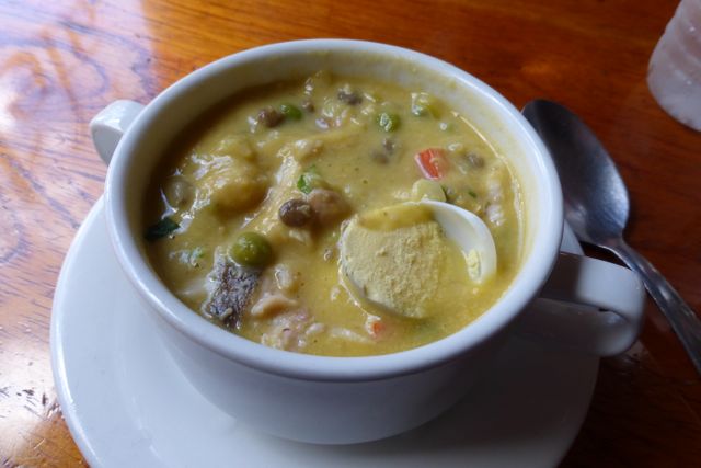 "Don't miss the Fanesca!" we were told. This is a soup that is served only for a few days before Easter Sunday. It is made with 12 types of legumes and grains, representing the disciples of Christ, in a base of salt cod cooked in milk. We found it at Cafe Austria where the chef is a native Cuencan. It was delicious.