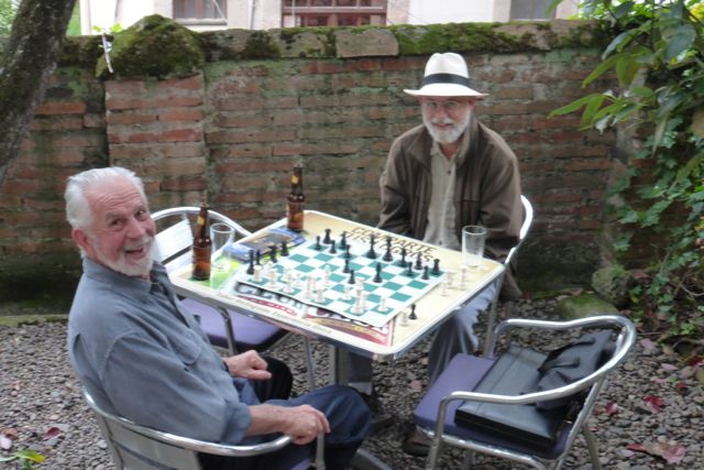 This is Ron Lively, retired airline pilot, who we met on the bridge one day. We kept running into him around town so we got to know him, visited his home, and when he found out that Winn plays chess, he brought his set over so they could play in the Wunderbar garden.