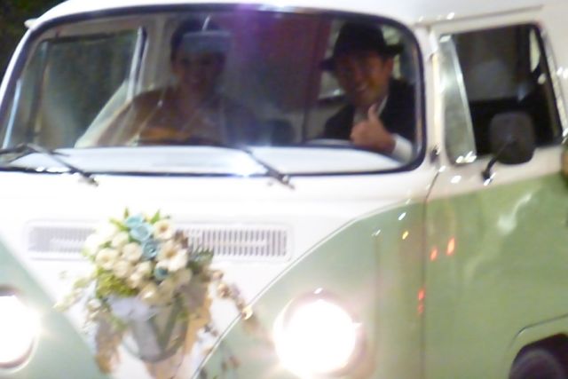 How fun! After leaving Republic Sur, heading to our house, we saw this happy couple leaving their wedding in a nicely refurbished Volkswagon Van.