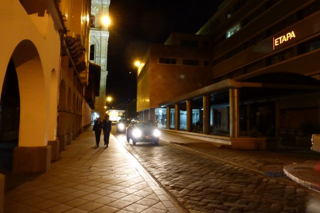 A quiet night in Cuenca. We feel very safe walking home together from an event.