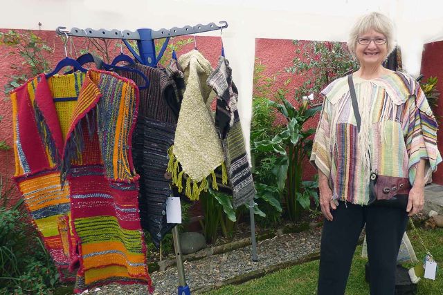 Much of the past month was spent preparing for my first Textile Show along with 5 other wonderful textile artists. My friend Patricia McCormick took this picture of me with my display of vests and capelets. Behind me is a clothes tree with my bags and purses.